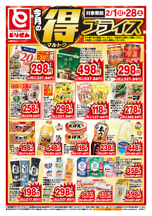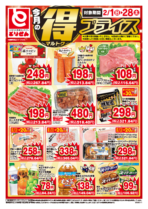 「安全です!新鮮です!とりせん!」をモットーに、毎日の生活にかかせない食料品や家庭用品をお求めやすい価格で提供しています。